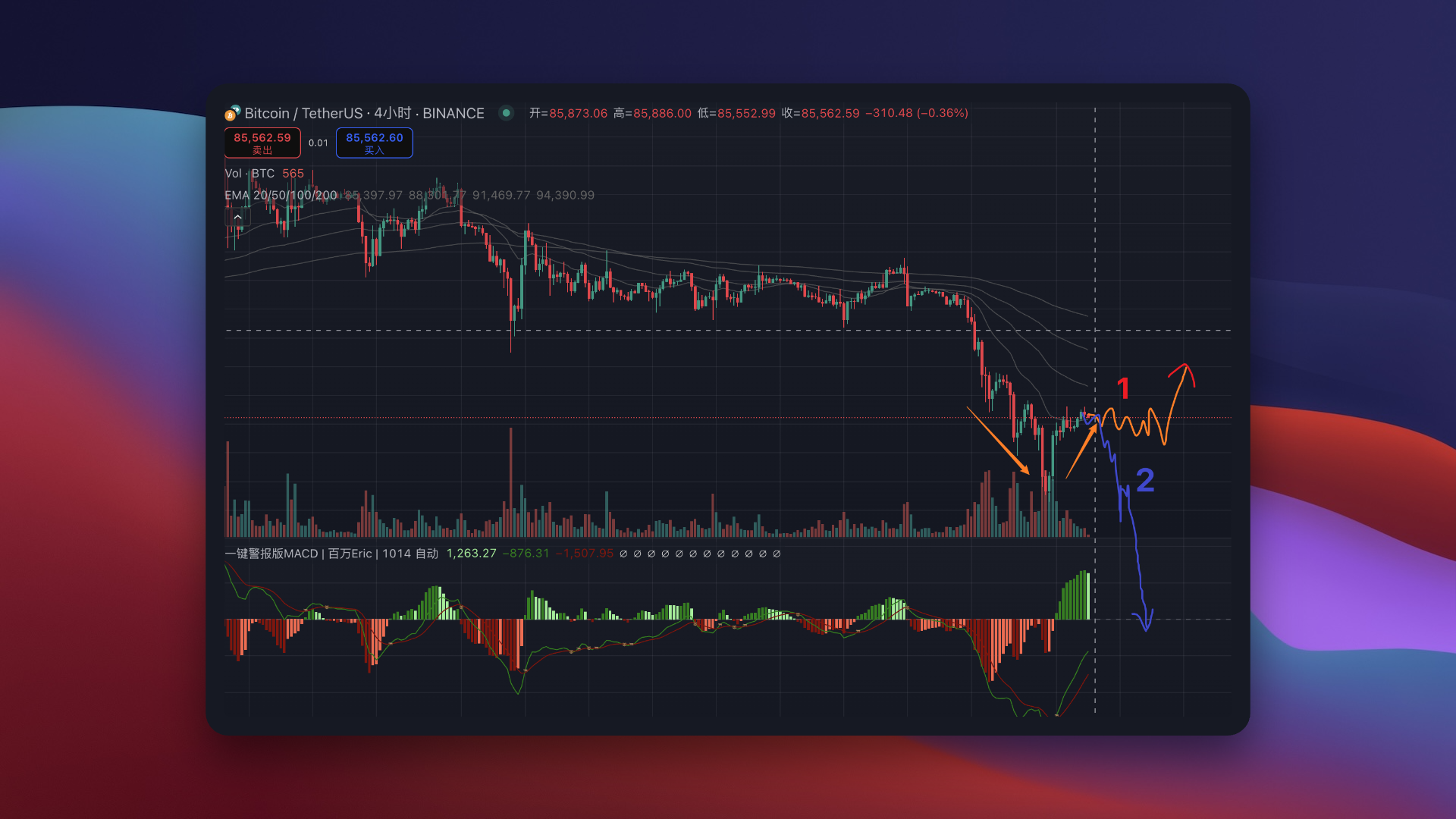 - 如果跌破支撑,下一个关注位置是83000